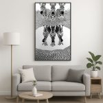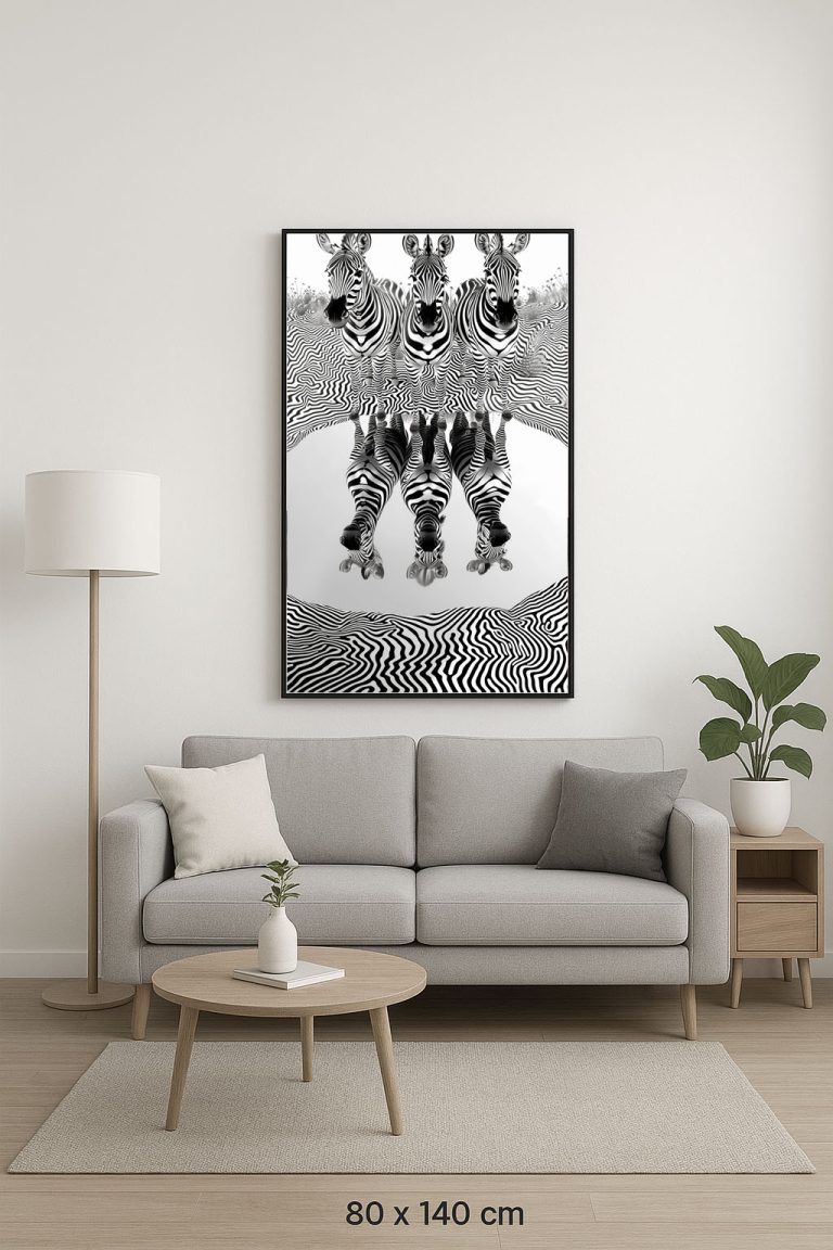 Escher-achtige grafische voorstelling van drie zebra’s die gespiegeld worden in een plas in een abstract landschap. Dit werk komt het best tot zijn recht met een zwarte-zilveren professioneel op maat gemaakte baklijst. Het is afgedrukt op geborsteld aluminium, dat bij verschillende lichtsituaties, anders overkomt.
