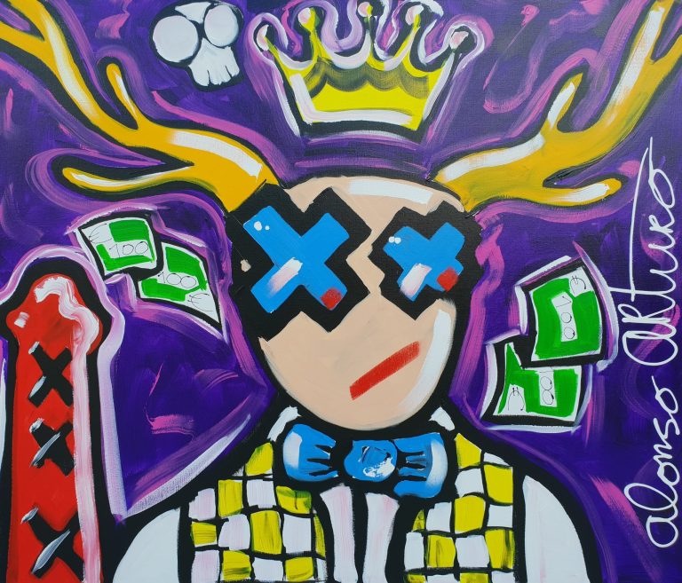 In geheel eigen stijl creëert Alonso zijn eigen wereld op het doek. Kleurrijk en met charme.